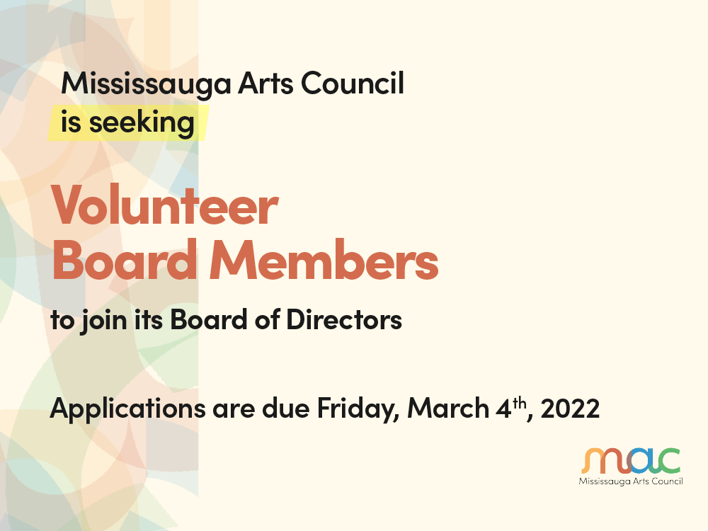 Are you passionate about the Arts? Do you live or work in Mississauga and want to become more involved in the growth of the Arts Sector in Mississauga? MAC is seeking up to three (3) volunteers to join our Board of Directors for a two-year term. Board members should be willing to commit a minimum of three (3) hours per month to the position.