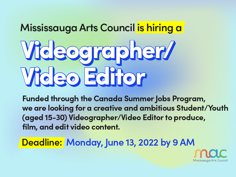 We have an exciting opportunity for a creative and ambitious individual to join our talented team and make a difference in the vibrant arts community in Mississauga as a Videographer and Video Editor. The successful candidate will be working both independently and as part of a team. This position is funded through the Canada Summer Jobs Program.