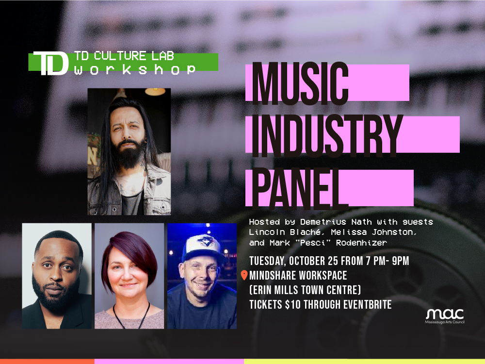 Learn from the experts about when and how to grow your music admin team. This engaging panel, led by Demetrius Nath (Mississauga Music) will introduce you to key players in the music industry and their roles, and answer all you questions about the non-musical players. Network with your colleagues and meet Mississauga’s music industry experts: Lincoln Blaché (Record Label – MADE IN SAUGA® label), Melissa Johnston (Music Publishing at Metalworks Institute), and Mark “Pesci” Rodenhizer (Booker for The Rec Room).