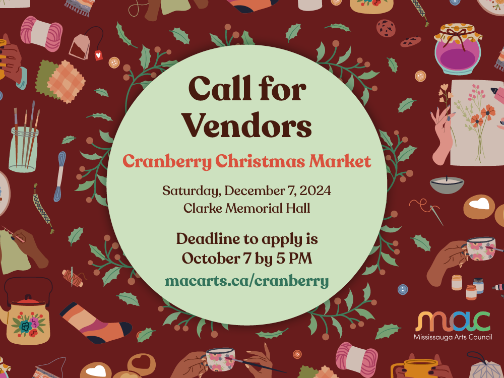Mississauga Arts Council’s (MAC) Cranberry Christmas Market is back! Apply today to be a vendor at our curated 2024 holiday market on December 7, 2024 in Clarke Memorial Hall.