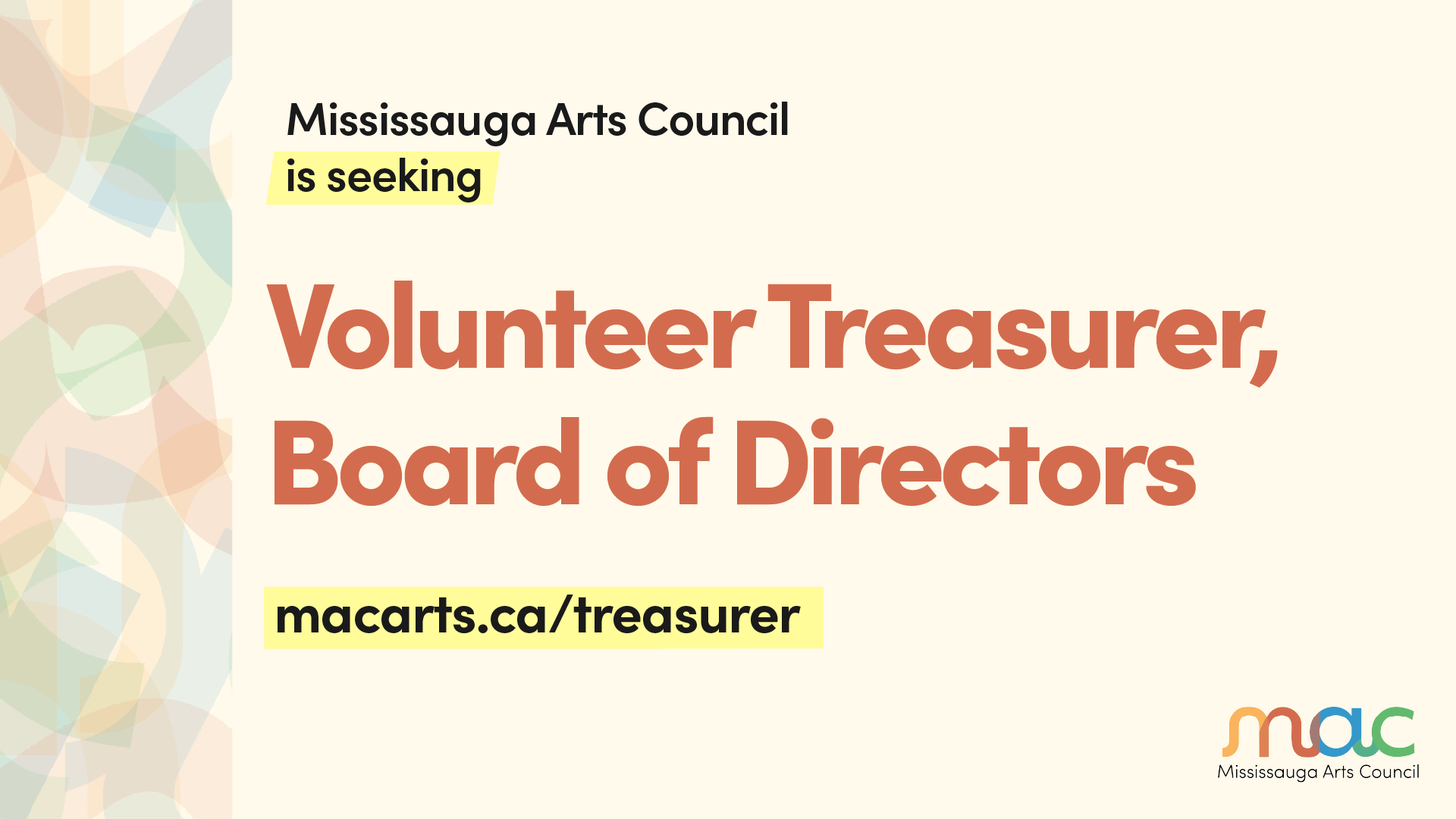 Are you passionate about the Arts? Do you live or work in Mississauga and want to become more involved in the growth of the Arts Sector in Mississauga? MAC is seeking a volunteer to join our Board of Directors as Treasurer for a two-year term (renewable).