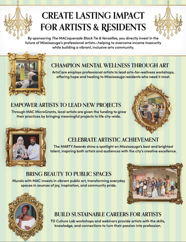By supporting the MACsquerade Black Tie & Versailles, you’re investing in the future of Mississauga’s professional artists — helping them overcome income insecurity and strengthening our vibrant, inclusive arts community.