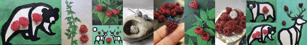 Keitha has selected photographs images of her artwork that match the theme rich natural flora and fauna surrounding of the area with Raspberry, Bear and Deer.