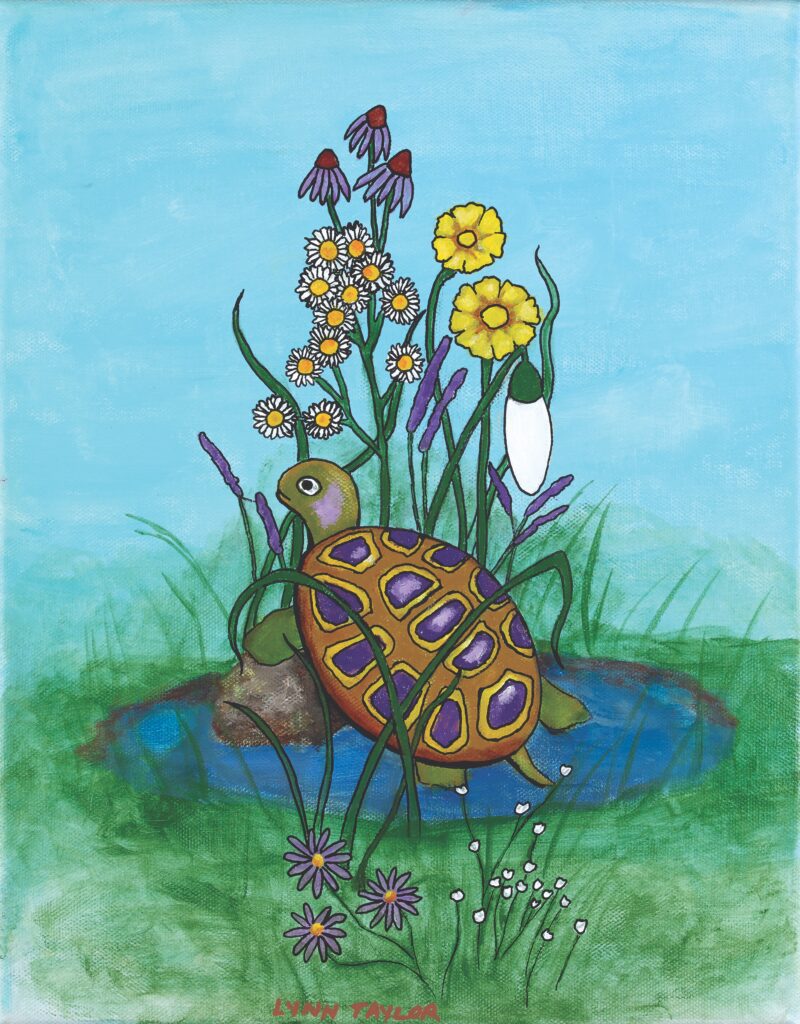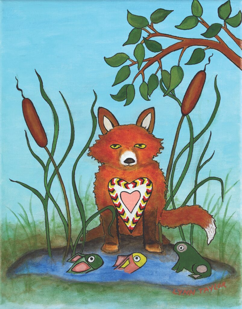 “I have painted local plants and animals that we can see in the Rattray Marsh. The Blue Heron, The Fox, The Turtle and The Beaver are some of the animals who reside in this area. The marsh area invites growth of various plants and the water creates homes and shelter for the water creatures. The beavers’ dams help enhance the protection of some of the fish species. To me, there are so many vibrant colours in nature that I hoped to capture in these paintings.” – Lynn Taylor